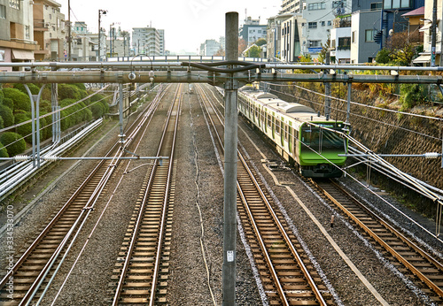 Fototapeta premium Train goes through one of many railroad in Tokyo