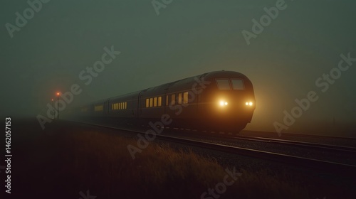 Naklejka premium Train in Fog: A lone train cuts through a dense fog, its headlights piercing...