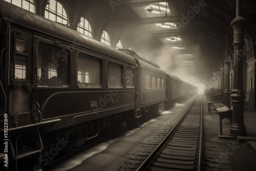 © LAYHONG, Fototapeta premium Train in the old train station at night. Retro style toned. Generative AI