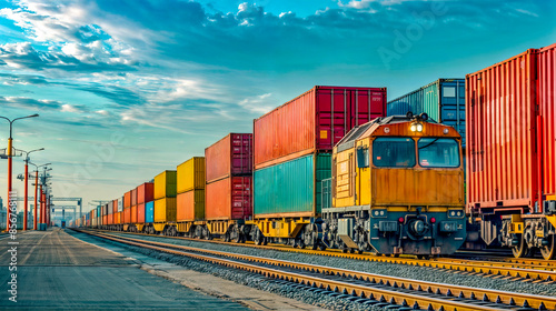 © OLHA, Obraz premium Train is traveling down the tracks with many containers on top of it.