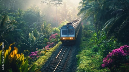 Naklejka premium Train journey through lush tropical rainforest with vibrant flora and fauna