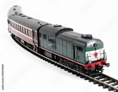 © DZIKRA , Obraz premium Train model with carriages runs on track, detailed green and maroon color scheme, in a studio setting