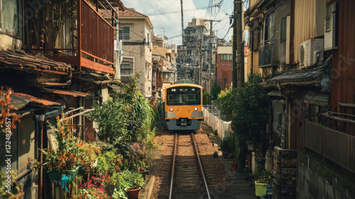 Naklejka premium Train moving through urban landscape with traditional houses on either side,...