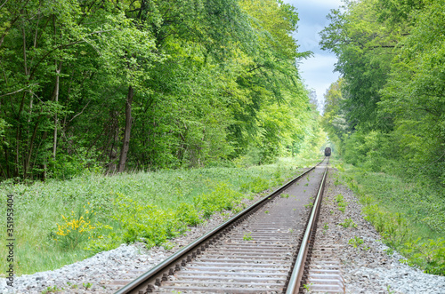 © Olha Rohulya, Fototapeta premium train on railway in green forest between trees