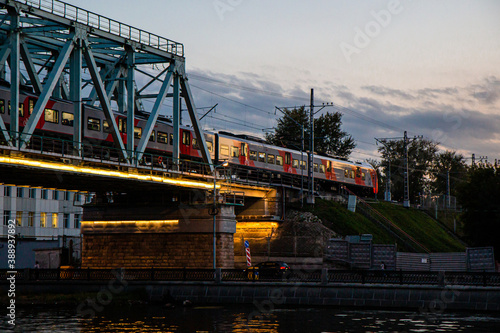 © Denis DZph Zakharov, Obraz premium train on the bridge evening bottom view