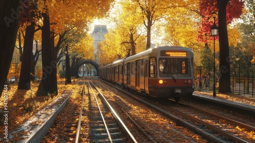 © paukan, Fototapeta premium Train Passing Through Autumnal Park