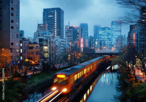 Obraz premium Train Passing Through Cityscape at Dusk with Reflections in Water,...