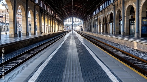 © Generative AI, Fototapeta premium Train Station Platform with Arched Architecture and Rails : Generative AI
