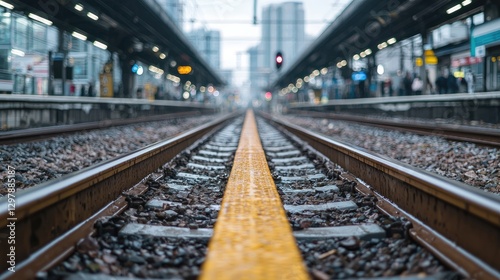 © KIMEHIME, Fototapeta premium Train tracks at a station on a cloudy day, perspective view. Possible use Stock photo for travel or transportation