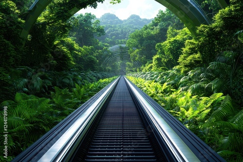 Fototapeta premium Train tracks cutting through lush jungle nature landscape serene environment perspective adventure awaits