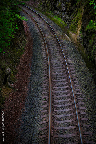 Fototapeta premium Train tracks direction to the high mountains.