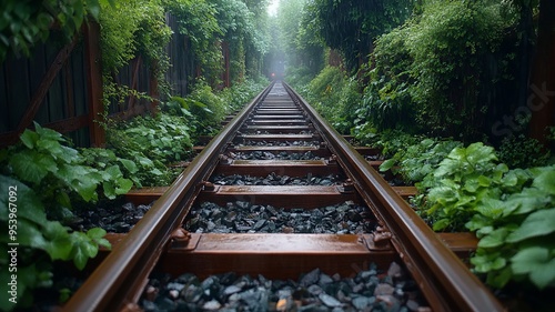 Obraz premium Train Tracks Disappearing into a Lush Green Tunnel