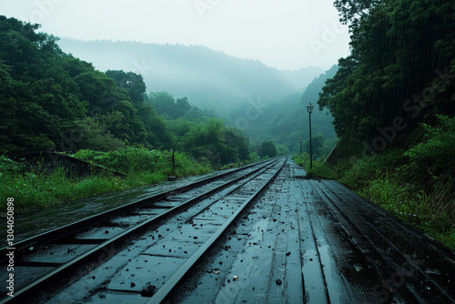 © TKStudio, Fototapeta premium Train tracks disappearing into a misty rainy landscape