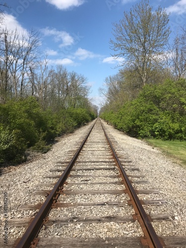© Sarah, Fototapeta premium Train Tracks Going Straight Back Into Woods