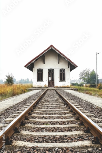 Obraz premium Train tracks lead to a small white house.