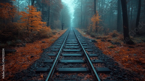Naklejka premium Train Tracks Leading into a Misty Forest