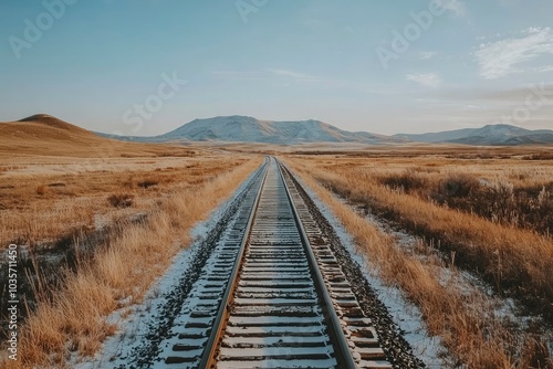 © Outkast, Fototapeta premium Train Tracks Leading Through a Snowy Mountain Valley