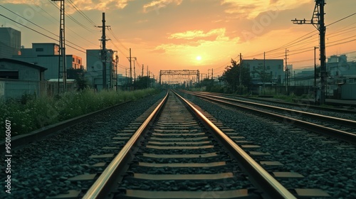 © Penatic Studio, Fototapeta premium Train Tracks Leading Towards a Sunset Over the Cityscape