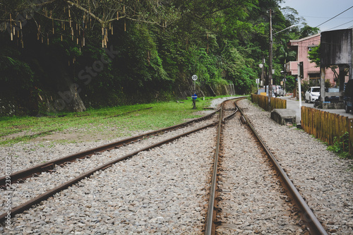 © iamtui7, Fototapeta premium train tracks on gravel, two of railways or railroads tracks merge in a rural scene background, concept of journey