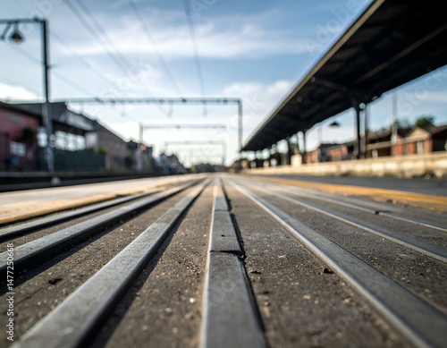 © fara, Fototapeta premium Train Tracks Perspective. Low angle view of railway tracks vanishing into the distance.
