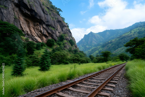 © Nur, Fototapeta premium Train tracks through lush green valley flanked by majestic mountains under a vibrant sky . Generative AI
