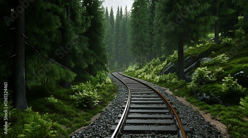 Obraz premium Train Tracks Winding Through a Lush, Misty Forest: 3D Render AI Generated