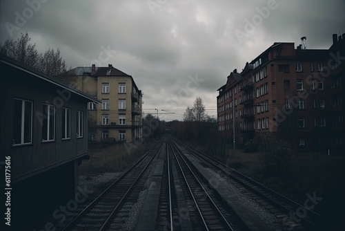 Fototapeta premium train tracks with urban skyline in the background. Generative AI
