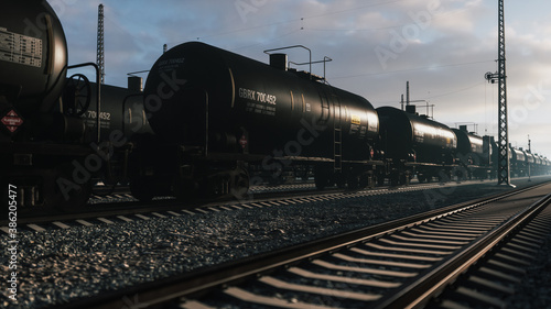 © Steamaze, Naklejka premium Train transportation tank with oil. Railway tank cars with oil. 3d illustration