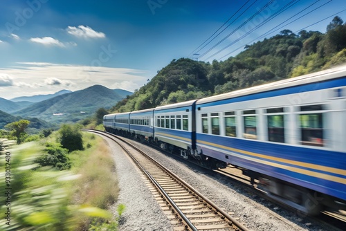 Naklejka premium Train travel through the picturesque, lush landscapes of Asia. Motion blur,...
