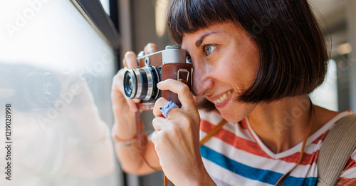© zhukovvvlad, Fototapeta premium train travel. Young woman enjoying a train ride with a camera. tourist takes pictures of beautiful tourist places on camera. film camera.