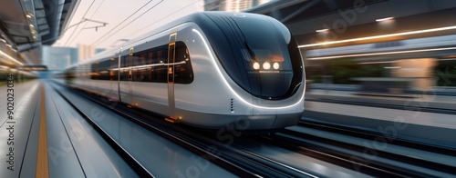 © homeganko, Fototapeta premium Train Traveling Through City at Sunset
