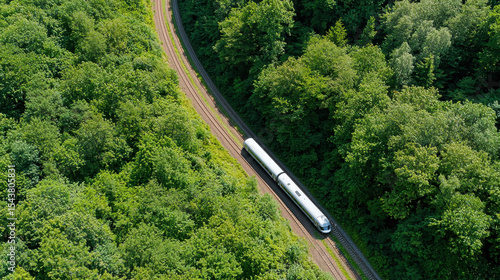 © Thanakit , Fototapeta premium Train travels along winding track through lush green forest, showcasing beauty of nature and transportation