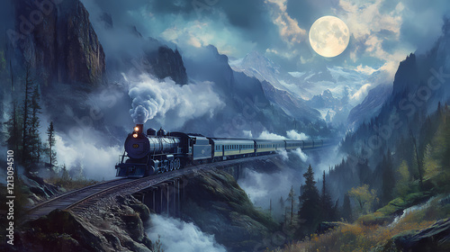 © Thiago, Fototapeta premium train travels misty mountain