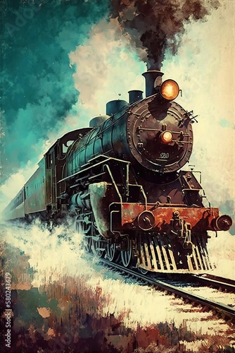 Fototapeta premium Train vintage contemporary oil painting (Ai generated)