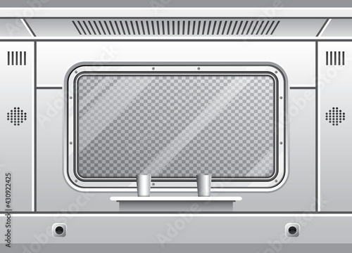 Fototapeta premium Train Wagon Interior with Window and Gray Wall. Passenger Compartment with...