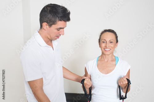© Adam Gregor, Obraz premium Trainer hilft Rentnerin mit Fitnessübung