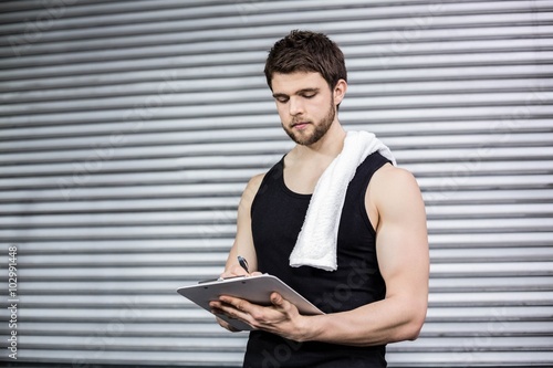 Naklejka premium Trainer taking notes at crossfit gym