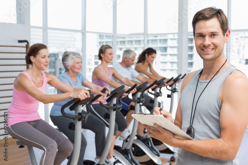 © WavebreakMediaMicro, Obraz premium Trainer with people working out at spinning class