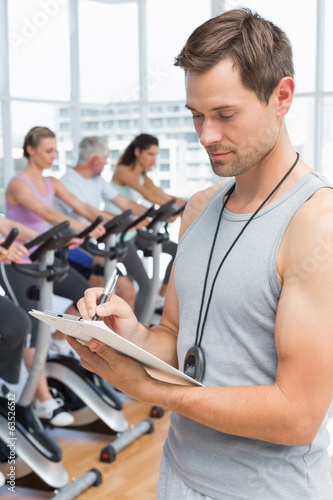 © WavebreakmediaMicro, Obraz premium Trainer with people working out at spinning class