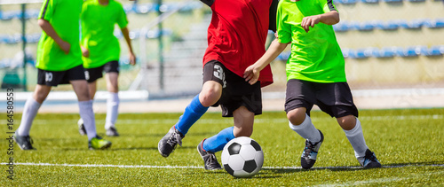 Fototapeta premium Training and football match between youth teams. Young boys playing soccer. Football match for children. Training and football soccer tournament