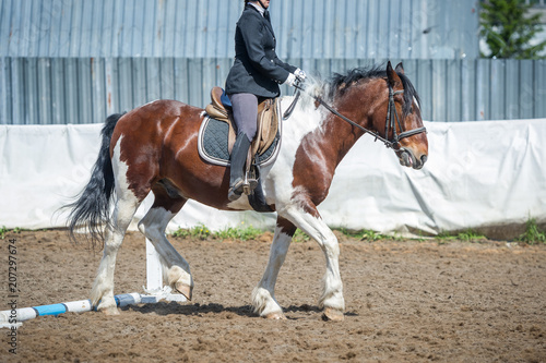 Obraz premium Training in horse riding, entry level. Cavaletti on a trot