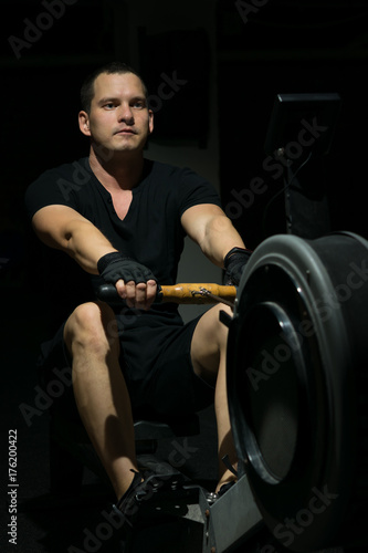 Fototapeta premium training on a cardio boating machine. against a dark background