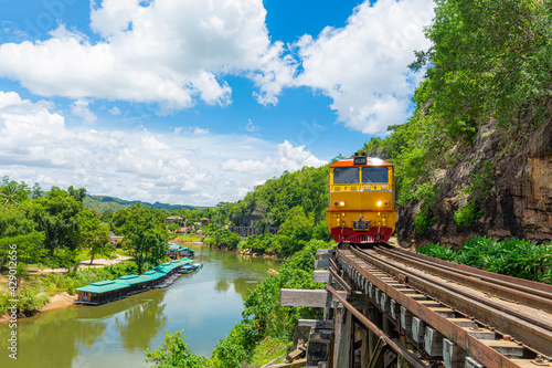 Naklejka premium trains running on death railways track crossing kwai river in kanchanaburi...