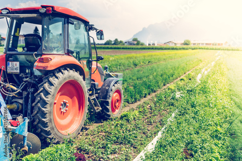 © Patrick Daxenbichler, Naklejka premium Traktor auf Acker, Landwirtschaft, blauer Himmel