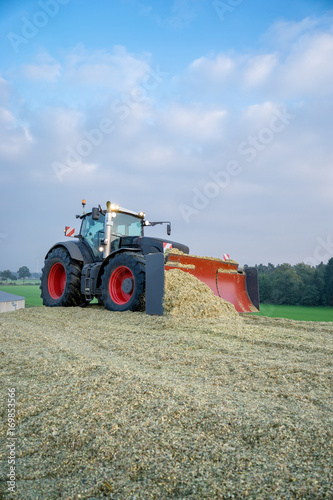 Obraz premium Traktor planiert Maishaufen, Hochformat