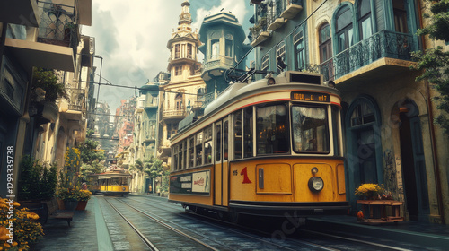 © Ruhi, Fototapeta premium Tram riding on retro city street game background with layers ready for animation. Trolley car on vintage cityscape parallax effect with antique buildings. Cartoon vector urban tramway railway commuter