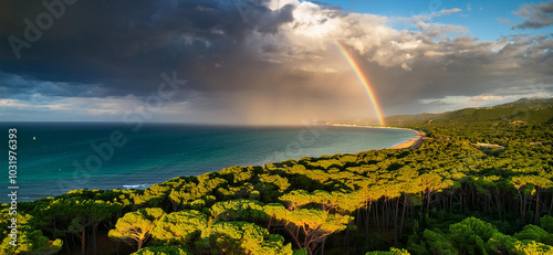 © ClaudioArnese, Obraz premium tramonto con nuvole minacciose e sole. pineta di pino marittimo in toscana, arcobaleno. visto dall'alto. vicino al mare