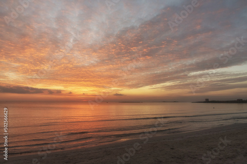 © vito, Fototapeta premium Tramonto sul mare con riflessi del sole sull'acqua e sulla sabbia.