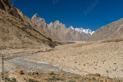 Fototapeta premium Trango tower family, Lobsang spire and river, K2 trek, Pakistan