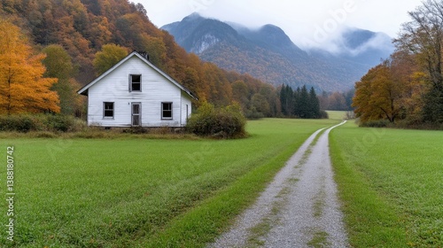 Fototapeta premium Tranquil, abandoned farmhouse nestled in a valley with autumn foliage